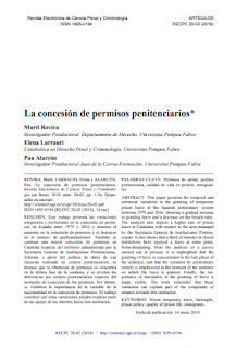 que presenta las variaciones temporales y territoriales en la concesión de permisos en España entre 1979 y 2016, mostrando el aumento en la concesión de permisos y el descenso en el número de quebrantamientos. Los autores también constatan una mayor concesión de permisos en Cataluña respecto del territorio administrado por la Secretaría General de Instituciones Penitenciarias. Además, a partir del análisis de datos de una encuesta realizada en centros penitenciarios, observan que la obtención de permisos se concentra en la última fase de la condena, y señalan diferencias por centros penitenciarios respecto del momento de concesión de los permisos. Por último, el trabajo visibiliza la importancia de la variable de la nacionalidad en la concesión de permisos y concluye que estas variaciones pueden explicar parte de las quejas de los internos hacia esta institución.